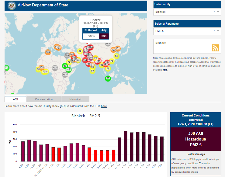 Посольство США в Кыргызстане также установило датчик. Он показывает индекс качества воздуха в режиме онлайн. Информация обновляется ежечасно.