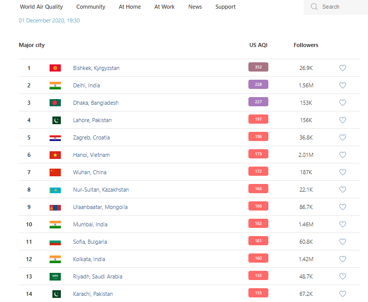 В рейтинге крупнейших городов мира по качеству воздуха World Air Quality Бишкек находится на 1-м месте.