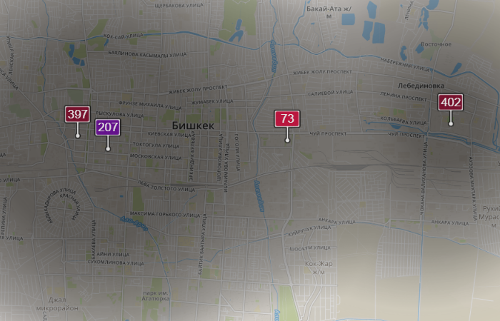 - в районе улиц Бейшеналиевой/Токтогула. Уровень загрязнения превышен в 7,88 раза: PM2.5 среднесуточный — 276 мкг/м³, на момент измерения — 397 мкг/м³;