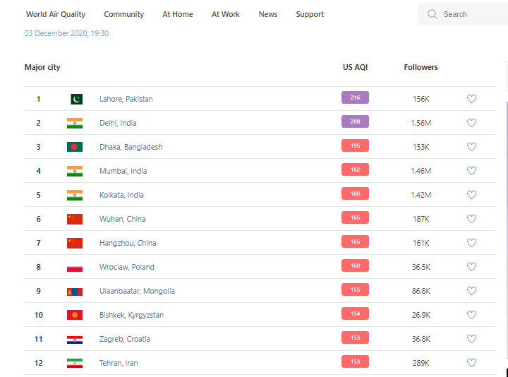 В рейтинге крупнейших городов мира по качеству воздуха World Air Quality на 19.30 Бишкек поднялся на 10-е место.