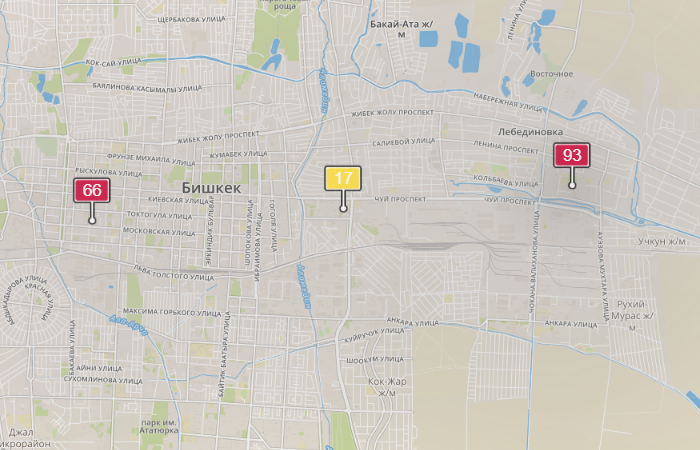 - в микрорайоне «Аламедин-1». Уровень загрязнения превышен в 3,25 раза: PM2.5 среднесуточный — 114 мкг/м³, на момент измерения — 93 мкг/м³.