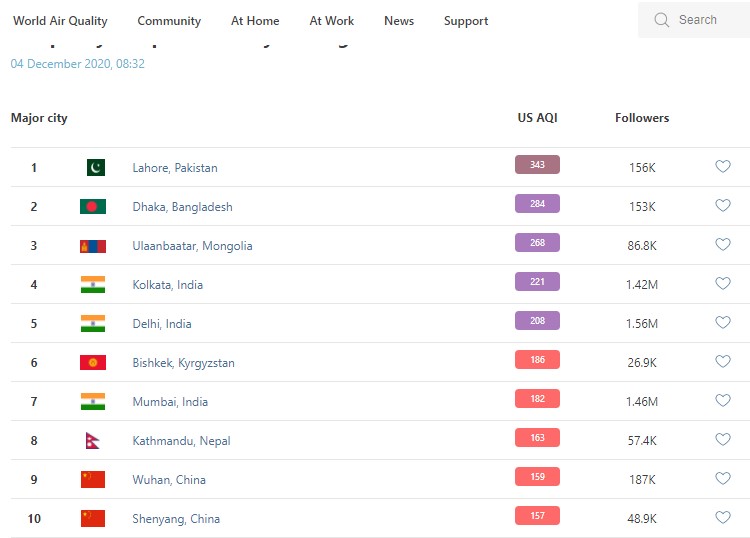 В рейтинге крупнейших городов мира по качеству воздуха World Air Quality на 8.30 Бишкек поднялся на 6-е место.