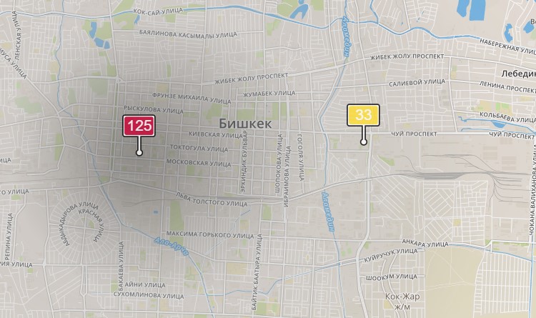 - в районе улиц Московской/Уметалиева. Уровень загрязнения превышен в 2,85 раза: PM2.5 среднесуточный — 100 мкг/м³, на момент измерения — 125 мкг/м³;