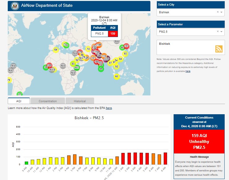 Посольство США в Кыргызстане также установило датчик. Он показывает индекс качества воздуха в режиме онлайн. Информация обновляется ежечасно.