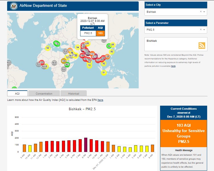 Посольство США в Кыргызстане также установило датчик. Он показывает индекс качества воздуха в режиме онлайн. Информация обновляется ежечасно.