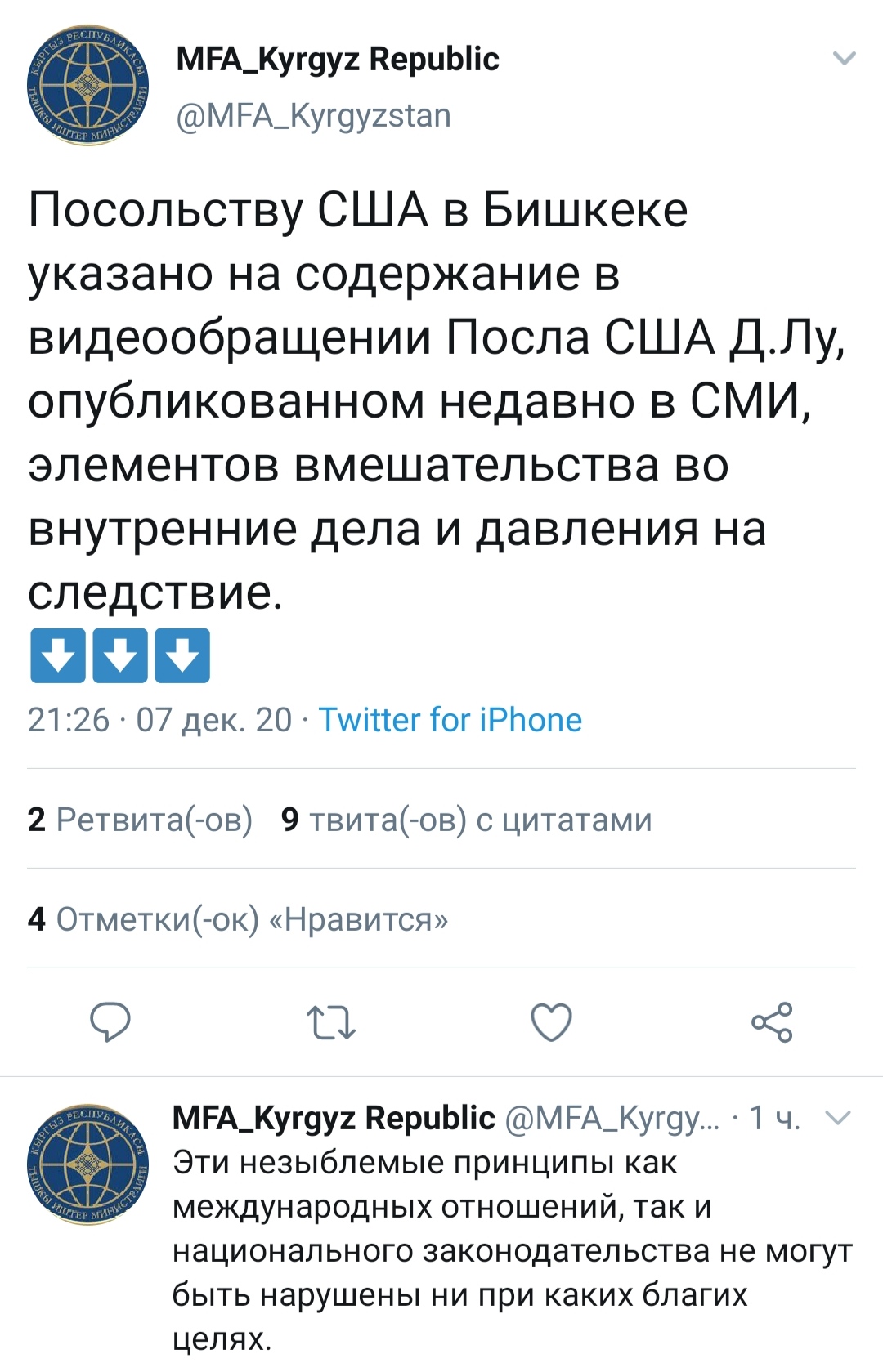 МИД Кыргызстана ответил на выступление Чрезвычайного и Полномочного Посла США в КР Дональда Лу. Заявление внешнеполитического ведомства опубликовано в микроблоге Twitter.