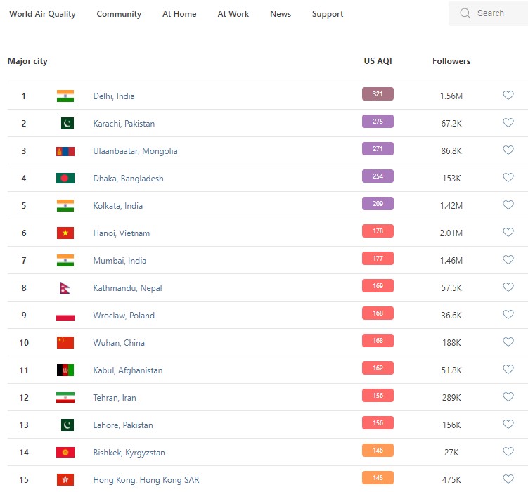 В рейтинге крупнейших городов мира по качеству воздуха World Air Quality на 8.30 Бишкек опустился на 14-е место.