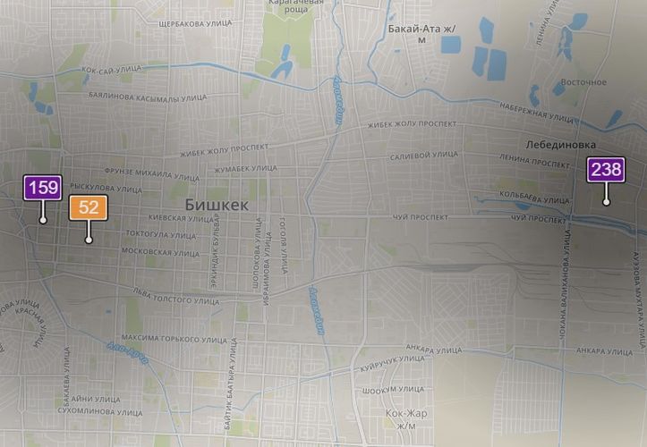 - в районе улиц Бейшеналиевой/Токтогула. Уровень загрязнения превышен в 4,54 раза: PM2.5 среднесуточный — 159 мкг/м³, на момент измерения — 159 мкг/м³;