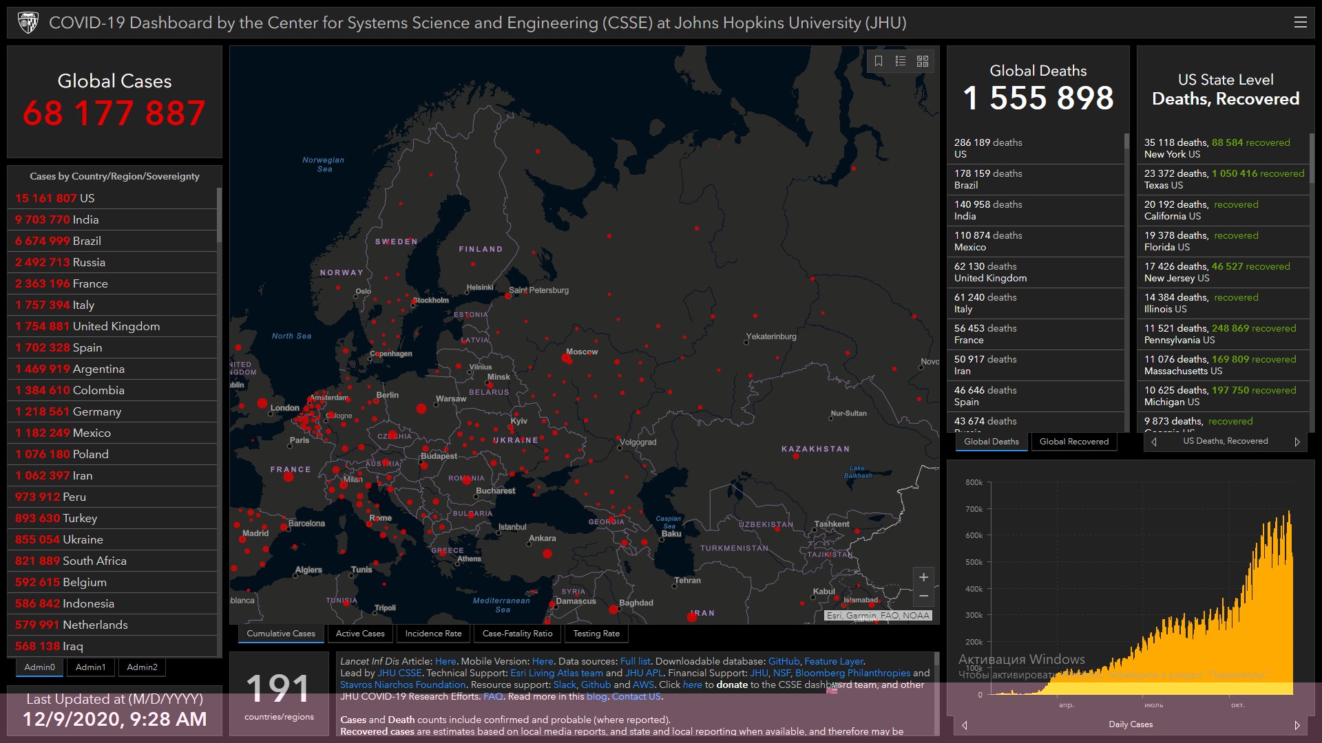 Всего в мире коронавирусом заразились 68 миллионов 177 тысяч 887 человек. Больше всего зараженных в США (15 миллионов 161 тысяча 807), Индии (9 миллионов 703 тысячи 770), Бразилии (6 миллионов 674 тысячи 999), России (2 миллиона 492 тысячи 713), Франции (2 миллиона 363 тысячи 169), Италии (1 миллион 757 тысяч 394), Великобритании (1 миллион 754 тысячи 881), Испании (1 миллион 702 тысячи 328), Аргентине (1 миллион 469 тысяч 919) и Колумбии (1 миллион 384 тысячи 610).