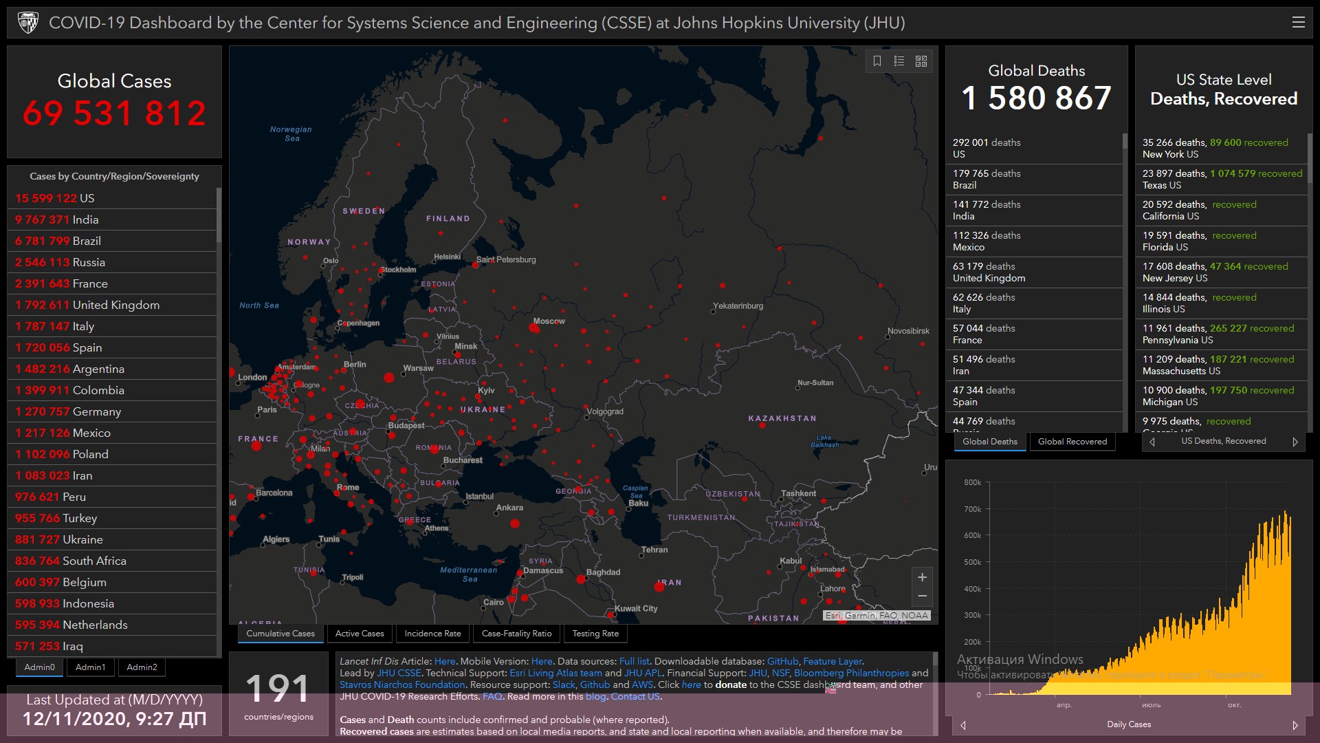 Всего в мире коронавирусом заразились 69 миллионов 531 тысяча 812 человек. Больше всего зараженных в США (15 миллионов 599 тысяч 122), Индии (9 миллионов 767 тысяч 371), Бразилии (6 миллионов 781 тысяча 799), России (2 миллиона 546 тысяч 113), Франции (2 миллиона 391 тысяча 643), Великобритании (1 миллион 792 тысячи 611), Италии (1 миллион 787 тысяч 147), Испании (1 миллион 720 тысяч 56), Аргентине (1 миллион 482 тысячи 216) и Колумбии (1 миллион 399 тысяч 911).