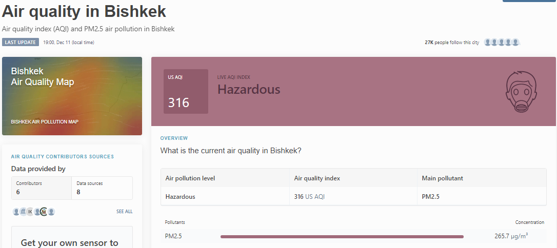 В 19.30 статус города отмечен как «опасно» (Hazardous). Индекс качества воздуха, по данным сайта, составляет 316 (AQI), а замеры концентрации мелких частиц PM2.5 показали 265,7 мкг/м³.