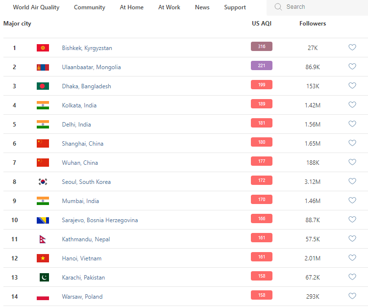 В рейтинге крупнейших городов мира по качеству воздуха World Air Quality Бишкек поднялся на 1-е место.