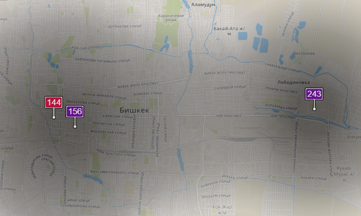 - в районе улиц Бейшеналиевой/Токтогула. Уровень загрязнения превышен в 5,57 раза: PM2.5 среднесуточный — 195 мкг/м³, на момент измерения — 144 мкг/м³;