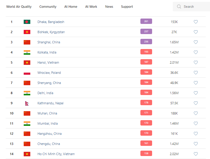 В рейтинге крупнейших городов мира по качеству воздуха World Air Quality Бишкек находится на втором месте.
