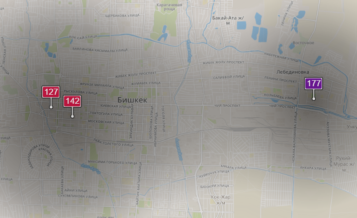 - в районе улиц Бейшеналиевой/Токтогула. Уровень загрязнения превышен в 4,4 раза: PM2.5 среднесуточный — 154 мкг/м³, на момент измерения — 127 мкг/м³;