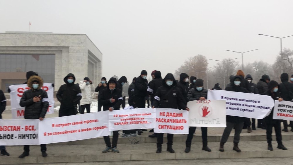 На митинг против митингов вышли представители общественных объединений «Убакыт-Время», «ЦИМ» и «Спартак». Их беспокоит то, что люди объединяются небольшими группами и выходят на митинги. Представители движений считают, что это плохо сказывается на имидже Кыргызстана, и предложили и. о. мэра Бишкека Балбаку Тулобаеву выделить специальное помещение для желающих митинговать.