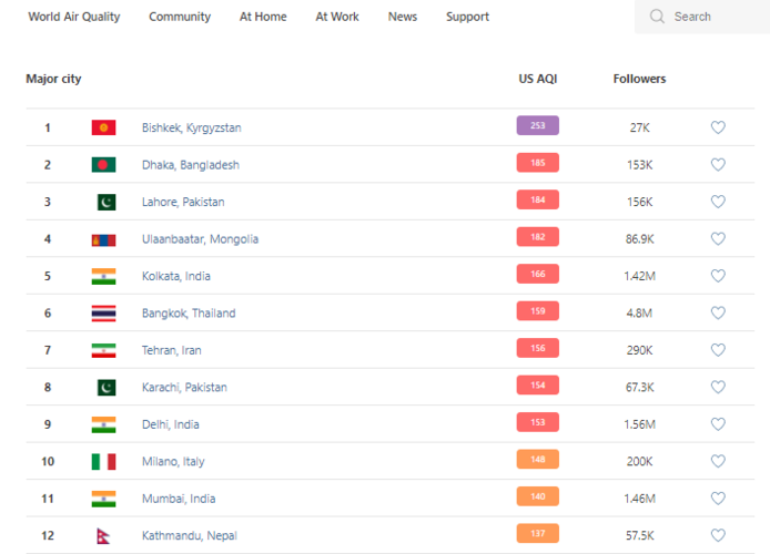 В рейтинге крупнейших городов мира по качеству воздуха World Air Quality Бишкек на 19.30 находится на первом месте.