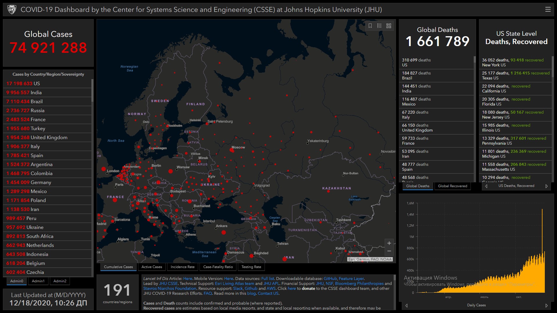 Всего в мире коронавирусом заразились 74 миллиона 921 тысяча 288 человек. Больше всего зараженных в США (17 миллионов 198 тысяч 633), Индии (9 миллионов 956 тысяч 557), Бразилии (7 миллионов 110 тысяч 434), России (2 миллиона 736 тысяч 727), Франции (2 миллиона 483 тысячи 524), Турции (1 миллион 955 тысяч 680), Великобритании (1 миллион 954 тысячи 268), Италии (1 миллион 906 тысяч 377), Испании (1 миллион 785 тысяч 421), Аргентине (1 миллион 524 тысячи 372) и Колумбии (1 миллион 468 тысяч 795).