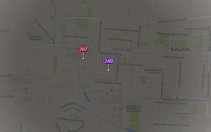 - в районе улиц Бейшеналиевой/Токтогула. Уровень загрязнения превышен в 6,62 раза: PM2.5 среднесуточный — 232 мкг/м³, на момент измерения — 297 мкг/м³;