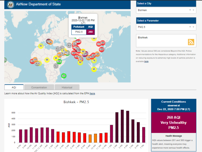 Посольство США в Кыргызстане также установило датчик. Он показывает индекс качества воздуха в режиме онлайн. Информация обновляется ежечасно.
