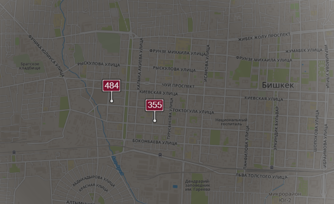 - в районе улиц Бейшеналиевой/Токтогула. Уровень загрязнения превышен в 4,42 раза: PM2.5 среднесуточный — 155 мкг/м³, на момент измерения — 484 мкг/м³;