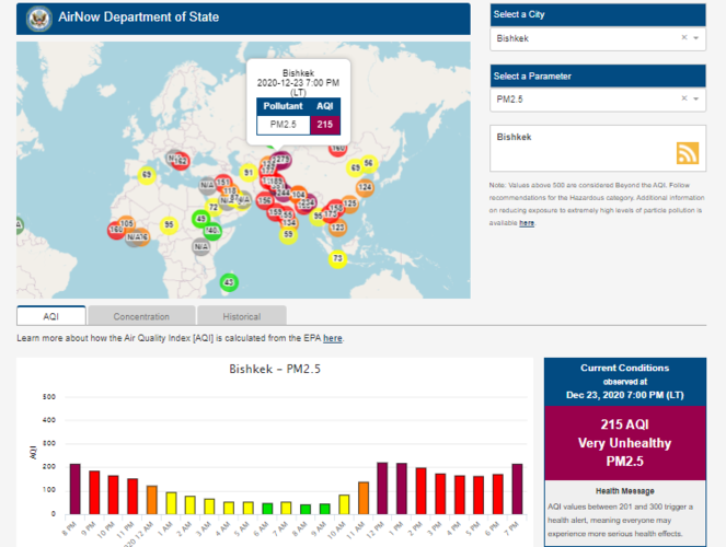 Посольство США в Кыргызстане также установило датчик. Он показывает индекс качества воздуха в режиме онлайн. Информация обновляется ежечасно.