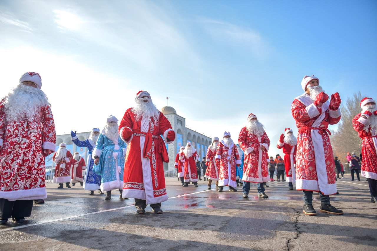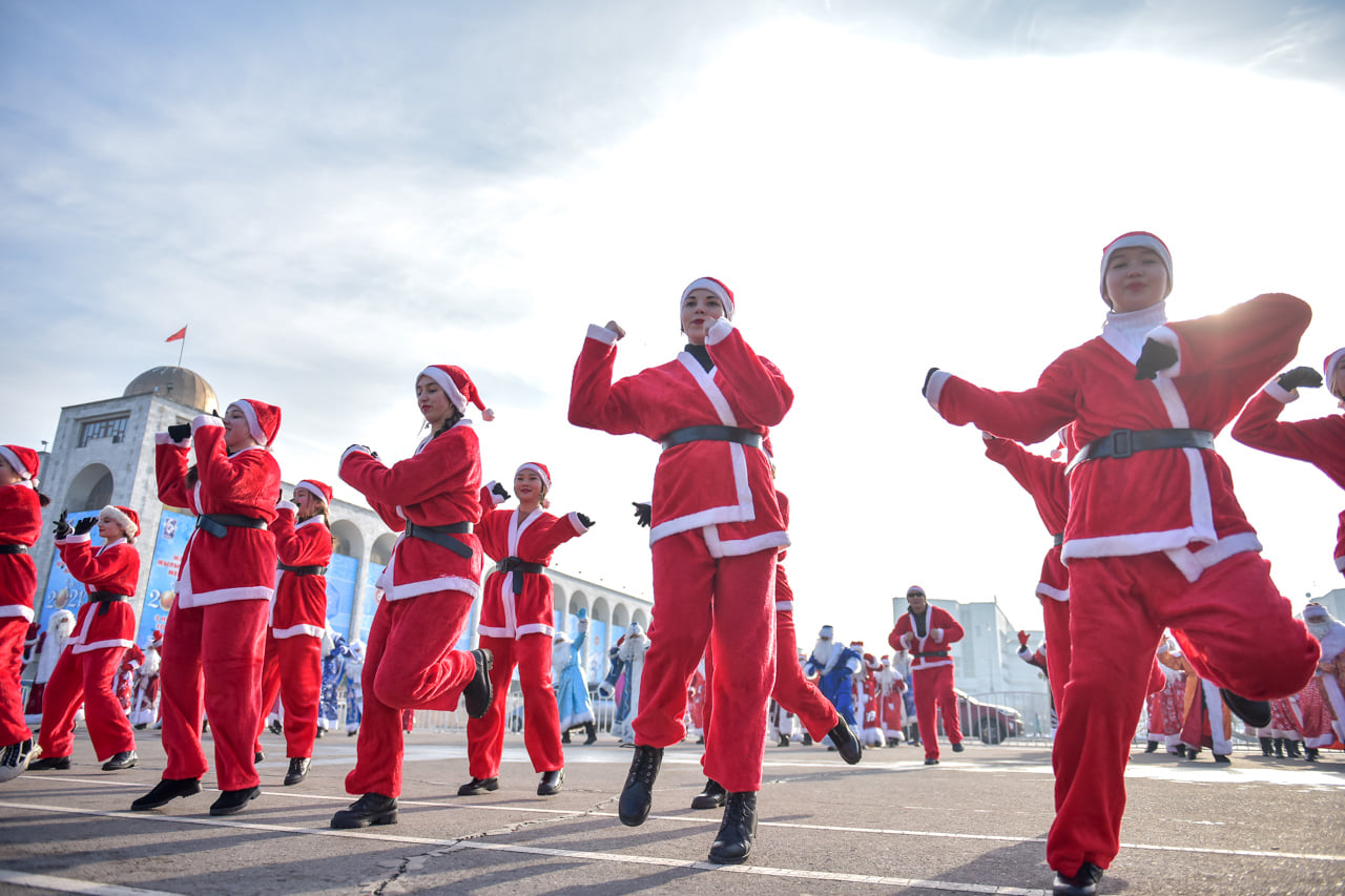 В Бишкеке на центральной площади Ала-Тоо прошел флешмоб с участием 120 человек в костюмах Деда Мороза и Санта Клауса. Об этом сообщили в пресс-службе мэрии.