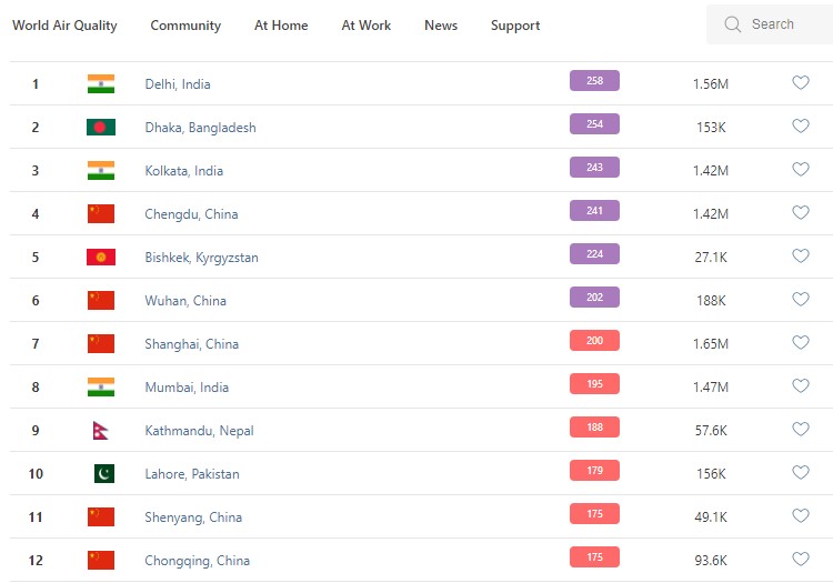 В рейтинге крупнейших городов мира по качеству воздуха World Air Quality Бишкек на 8.30 находится на пятом месте.