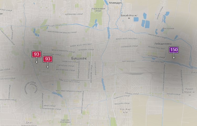 - в районе улиц Бейшеналиевой/Токтогула. Уровень загрязнения превышен в 4,8 раза: PM2.5 среднесуточный — 168 мкг/м³, на момент измерения — 93 мкг/м³;