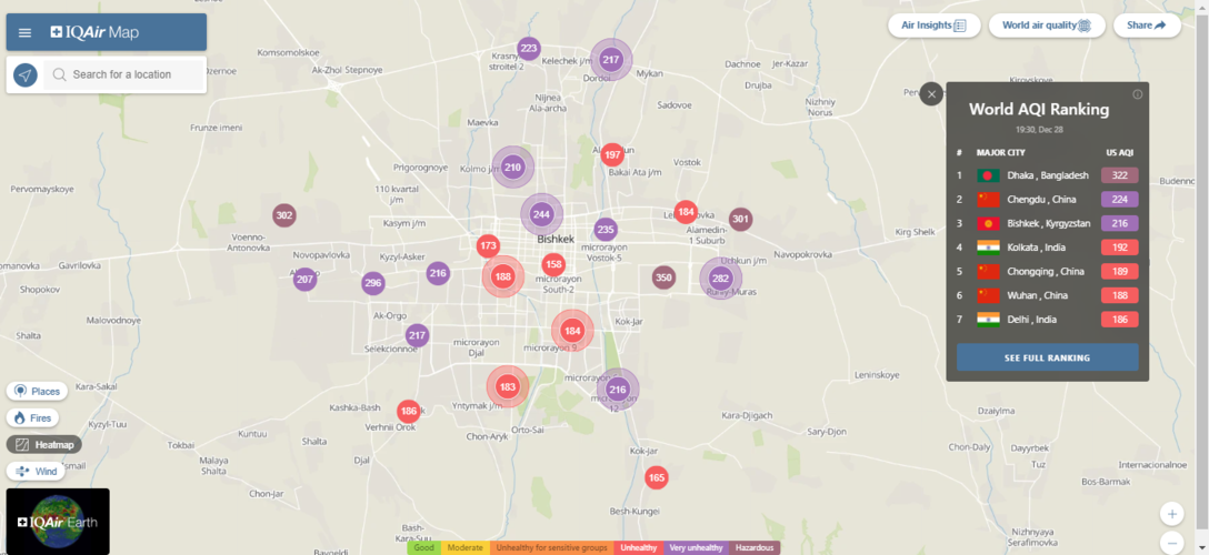 В рейтинге крупнейших городов мира по качеству воздуха World Air Quality Бишкек находится на третьем месте.