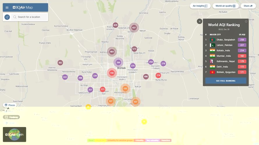 В рейтинге крупнейших городов мира по качеству воздуха World Air Quality Бишкек находится на седьмом месте.
