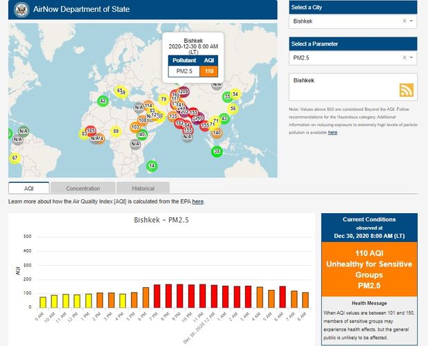 Информация обновляется ежечасно. На 8.00 индекс качества воздуха в районе дипломатической миссии — 110 (AQI).