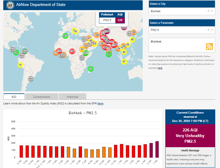 Информация обновляется ежечасно. На 8.00 индекс качества воздуха в районе дипломатической миссии — 226 (AQI).