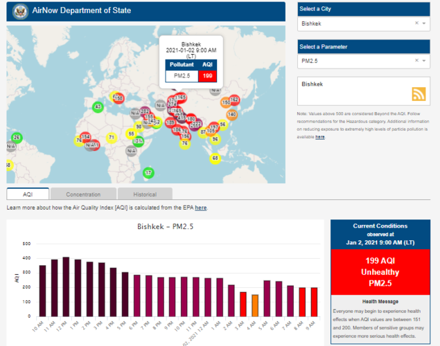 Информация обновляется каждый час. На 9.00 индекс качества воздуха в районе дипломатической миссии — 199 (AQI).