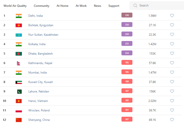 В рейтинге крупнейших городов мира по качеству воздуха World Air Quality Бишкек находится на втором месте.
