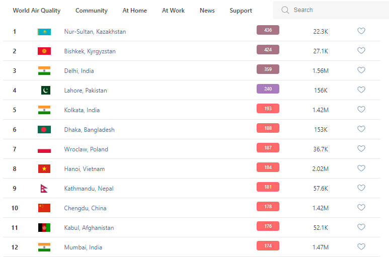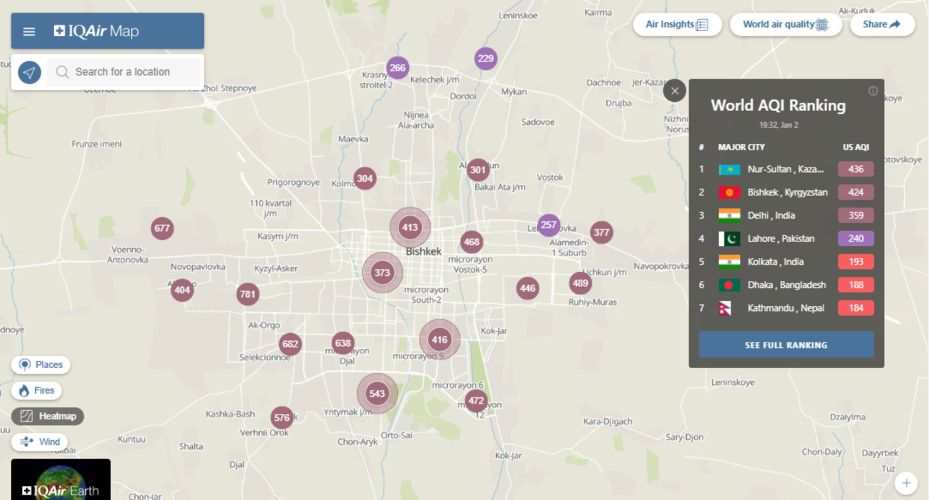 В рейтинге крупнейших городов мира по качеству воздуха World Air Quality Бишкек находится на втором месте.
