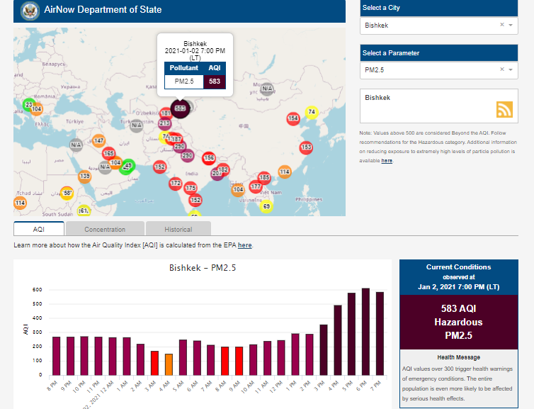 В 19.30 статус города отмечен как «опасно» (Hazardous). Индекс качества воздуха, по данным сайта, составляет 424 (AQI).