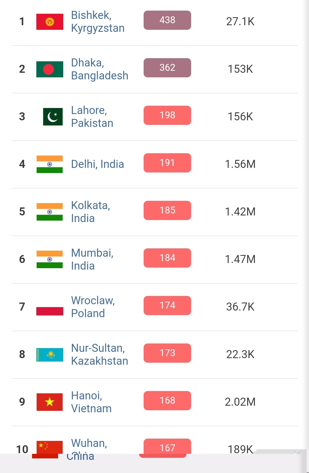 В 19.30 статус города отмечен как «опасно» (Hazardous). Индекс качества воздуха, по данным сайта, составляет 438 (AQI).