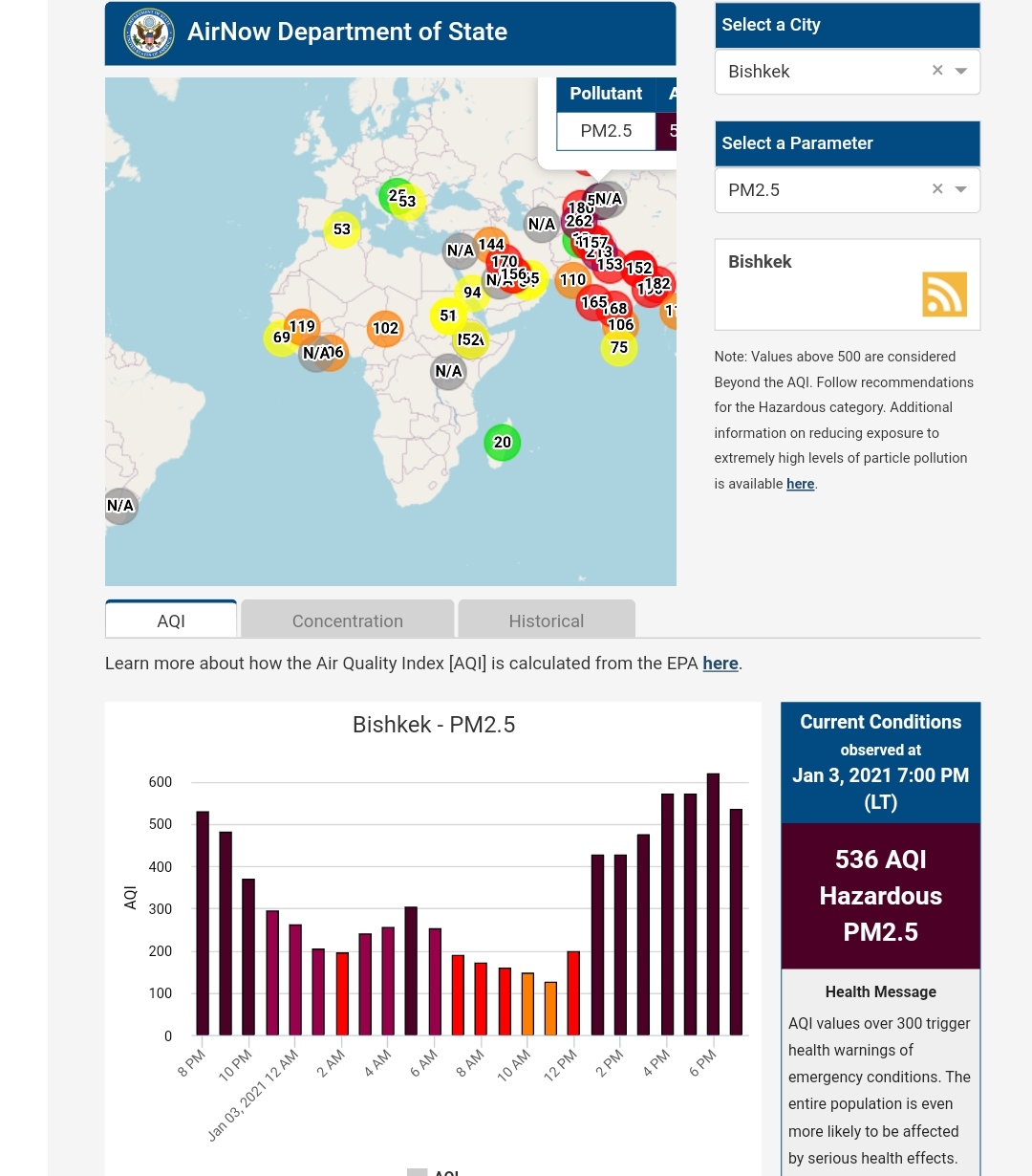 Информация обновляется каждый час. На 19.00 индекс качества воздуха в районе дипломатической миссии — 536 (AQI).