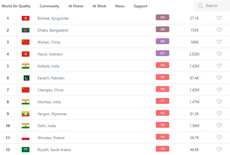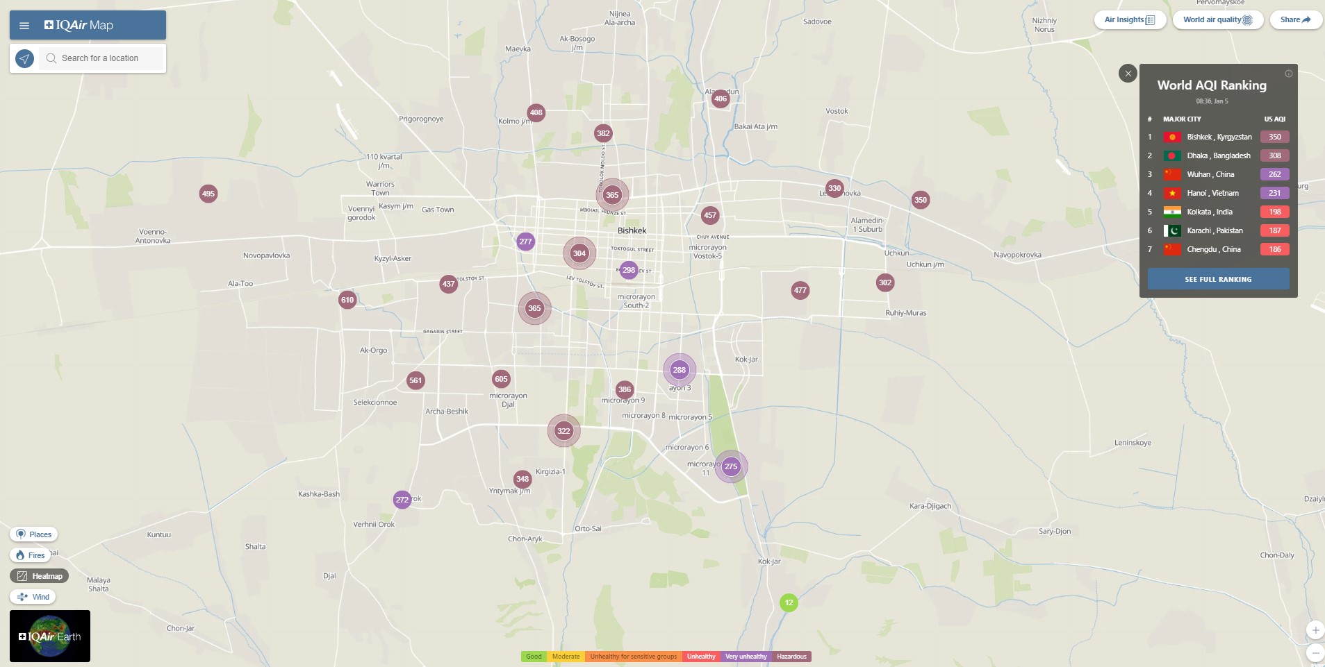 В рейтинге крупнейших городов мира по качеству воздуха World Air Quality Бишкек находится на первом месте.