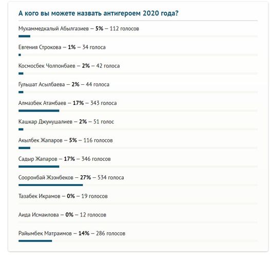 Читатели 24-kg.com считают, что звания «Антигерой года» заслуживает экс-президент Кыргызстана Сооронбай Жээнбеков. За это высказалось 534 человека, или 27 процентов опрошенных.