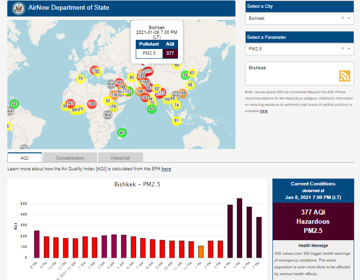 Информация обновляется каждый час. На 19.00 индекс качества воздуха в районе дипломатической миссии — 377 (AQI).