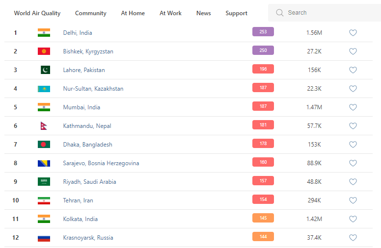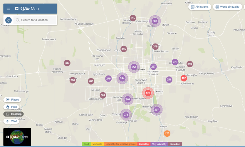 В рейтинге крупнейших городов мира по качеству воздуха World Air Quality Бишкек поднялся на второе место.