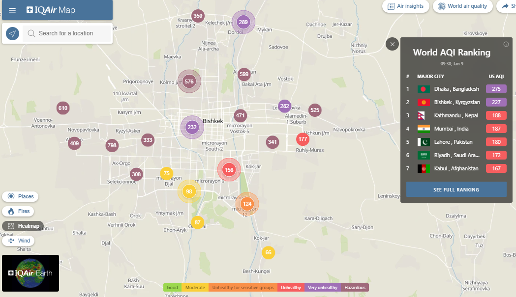В рейтинге крупнейших городов мира по качеству воздуха World Air Quality Бишкек находится на втором месте.