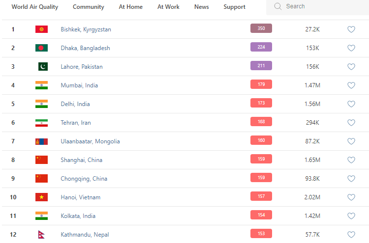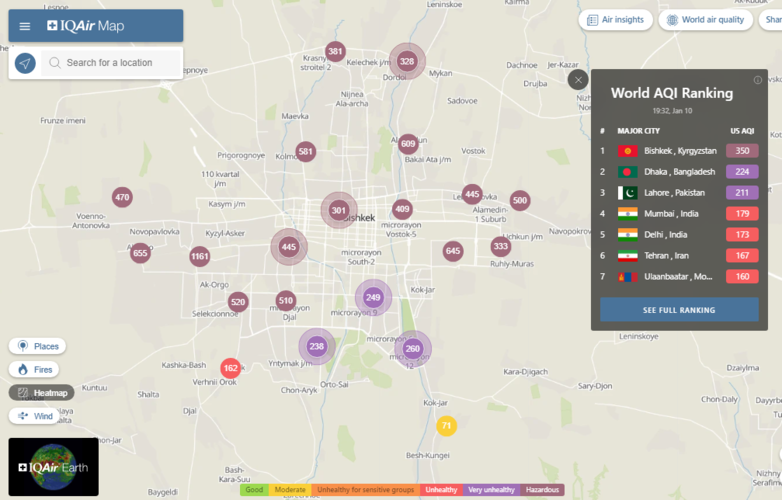 В рейтинге крупнейших городов мира по качеству воздуха World Air Quality Бишкек вновь поднялся на первое место.