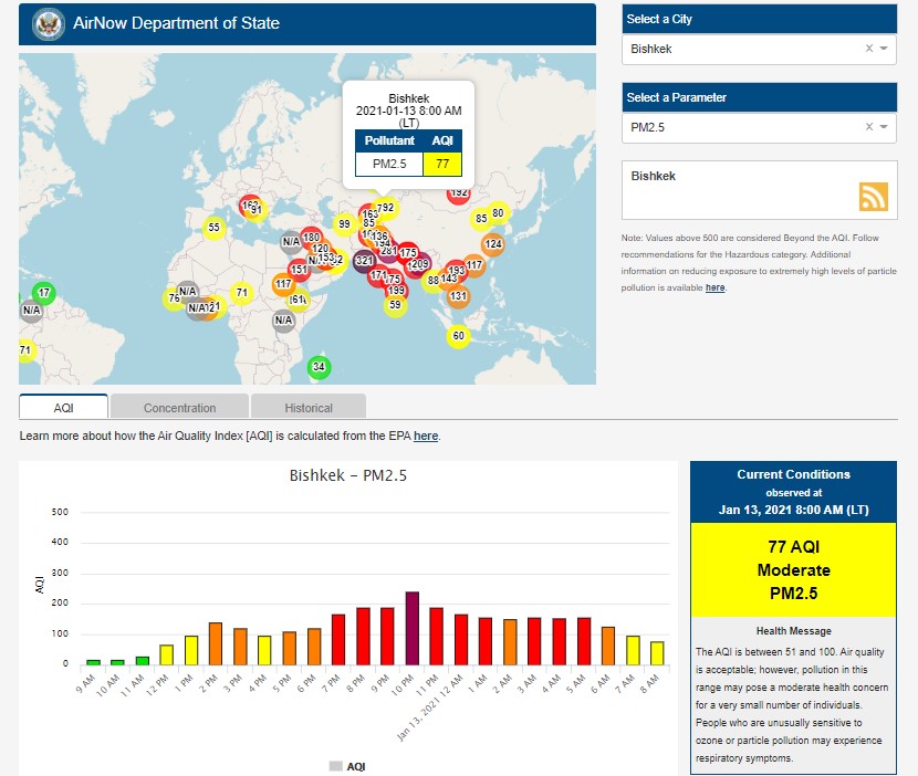 Информация обновляется каждый час. На 19.00 индекс качества воздуха в районе дипломатической миссии — 77 (AQI).