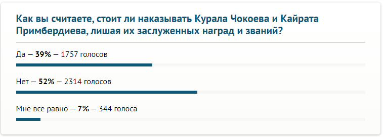 Более половины читателей 24-kg.com высказались против лишения певцов Курала Чокоева и Кайрата Примбердиева их званий и наград. Таковы результаты опроса.