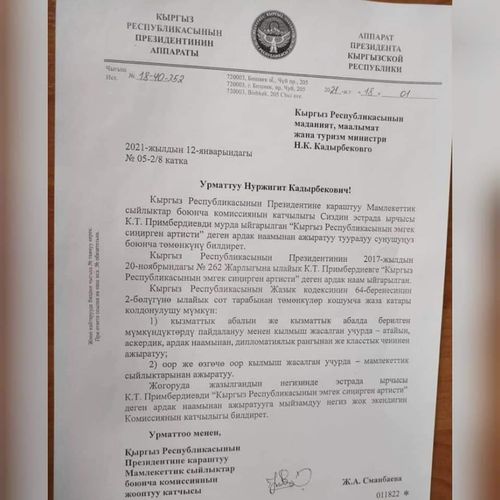 В связи с этим в аппарате президента пояснили, что для лишения Кайрата Примбердиева звания заслуженного артиста нет законных оснований.