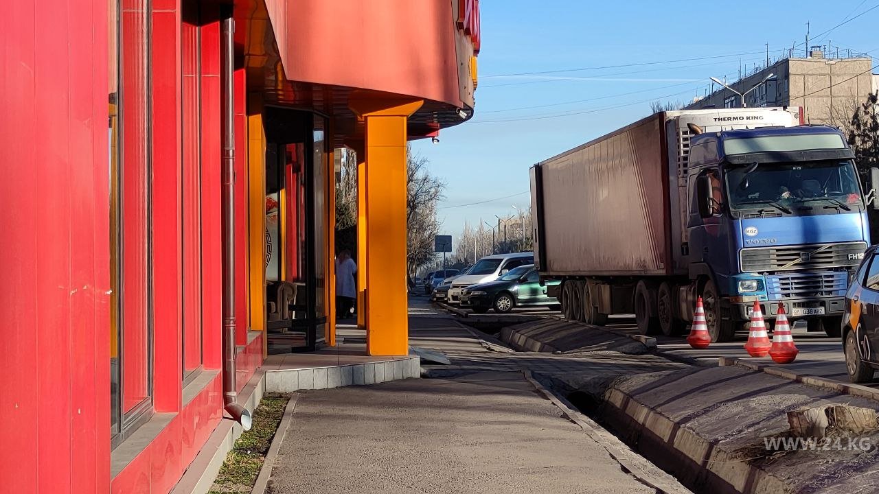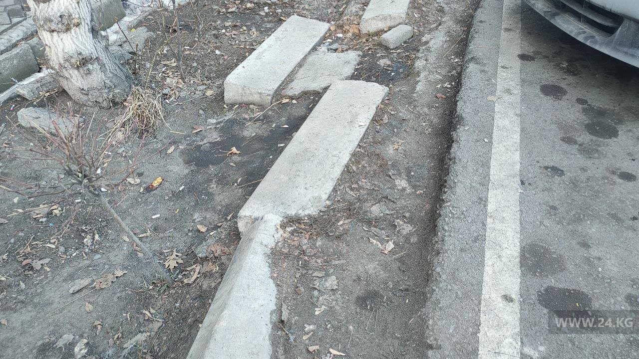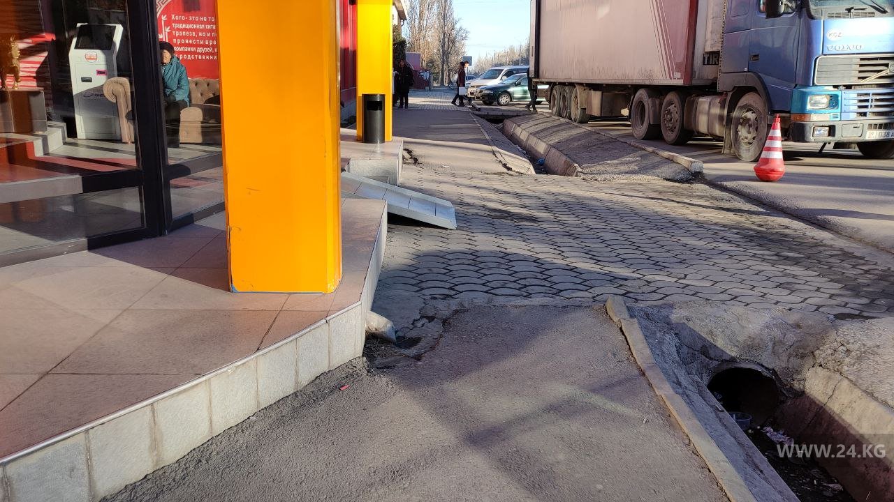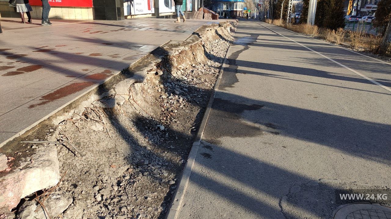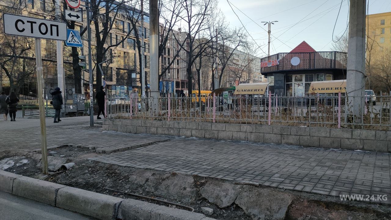 Невозможно не заметить, как на центральных улицах Бишкека выглядят тротуары, прилегающие к отдельным коммерческим объектам — покрошенная брусчатка, дефекты и ямы сплошь и рядом. Так выглядит дорога для пешеходов на пересечении улиц Абдрахманова и Боконбаева.