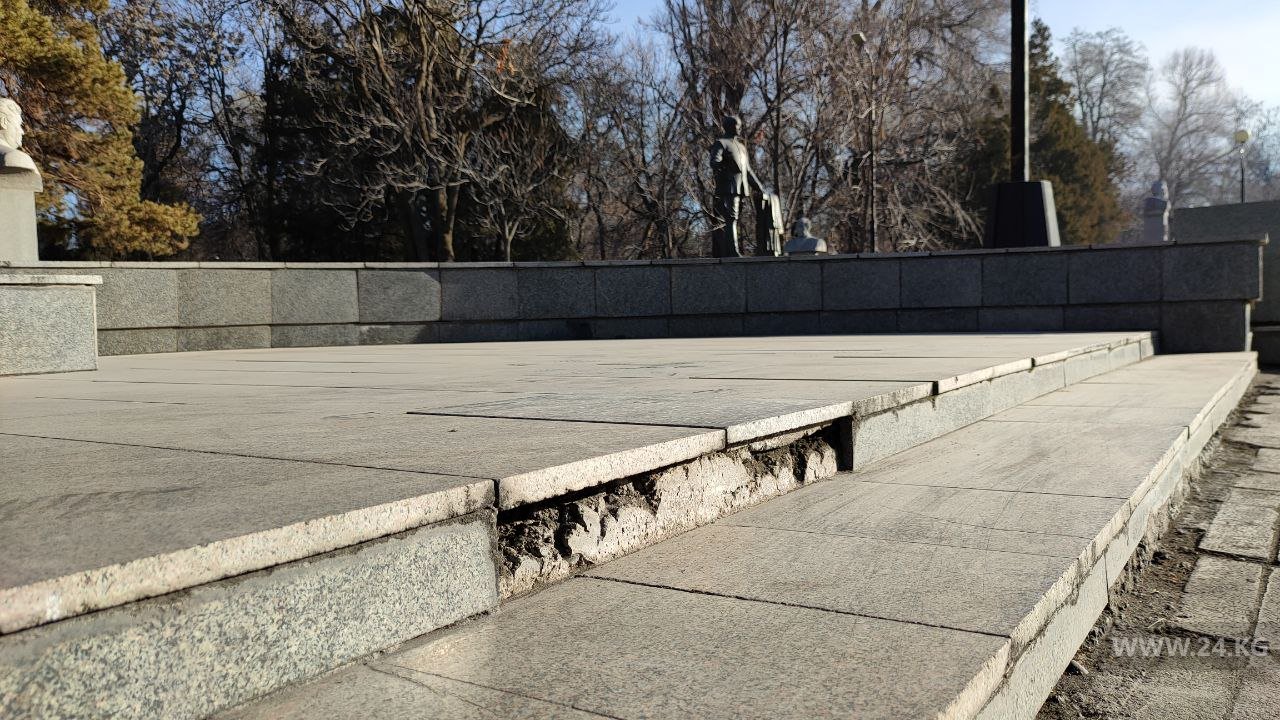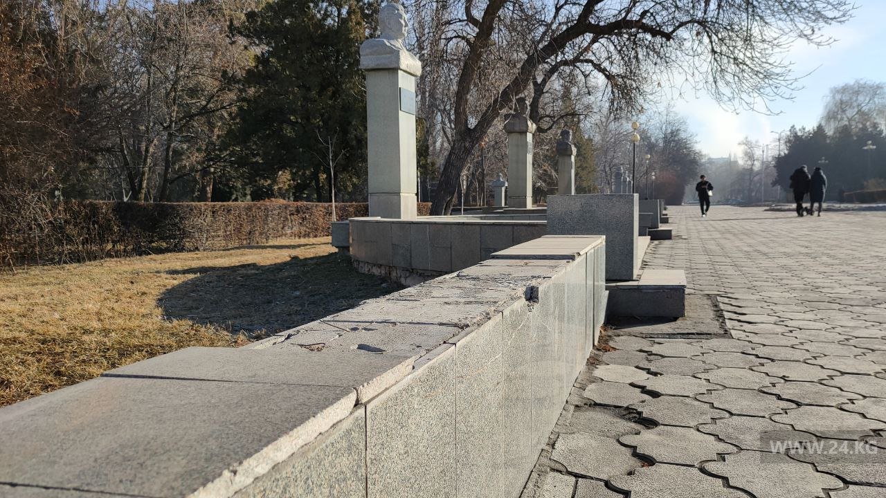 Еще на что следует обратить внимание муниципалитету — это аллея с бюстами известных политиков Кыргызстана возле здания Министерства культуры. Гранитная плитка на постаментах откалывается, появилось много трещин, памятники не ухожены, клумбы затоптаны. Однако озабоченности городских властей здесь не заметно.